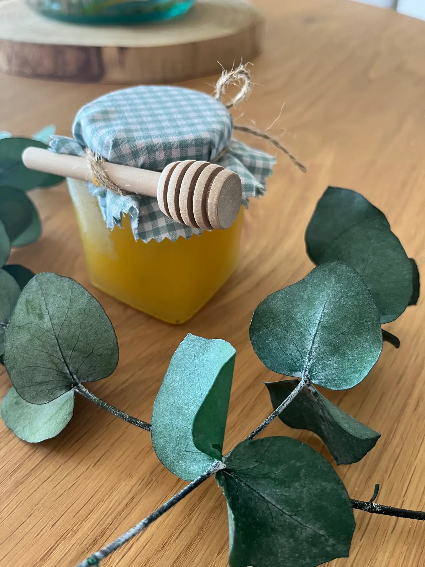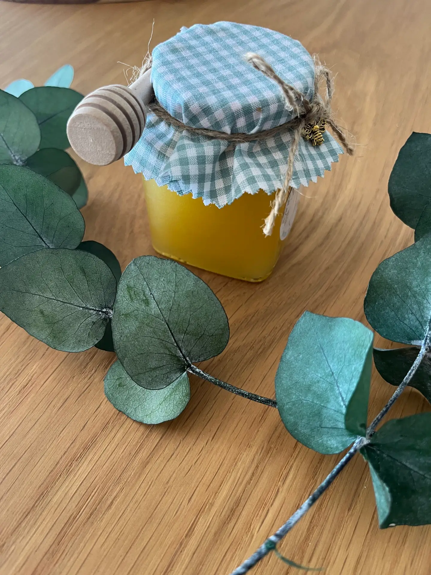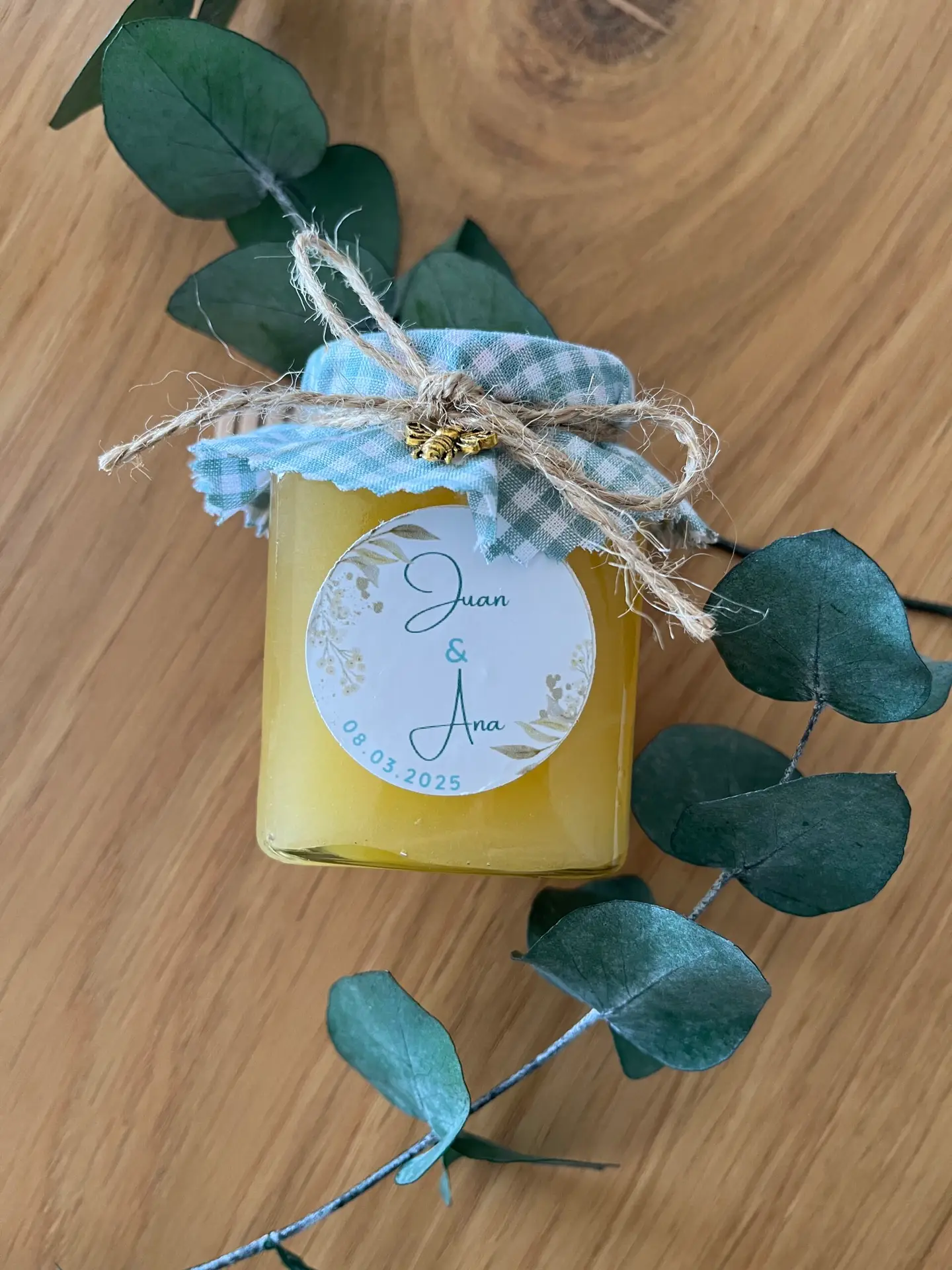 Cada frasco se presenta con una tapa decorada con tela vichy en tonos suaves, cuerda de yute natural y un pequeño charm de abejita dorada que añade un toque encantador. La etiqueta personalizada incluye los nombres y la fecha del evento, creando un recuerdo único que encantará a todos.
