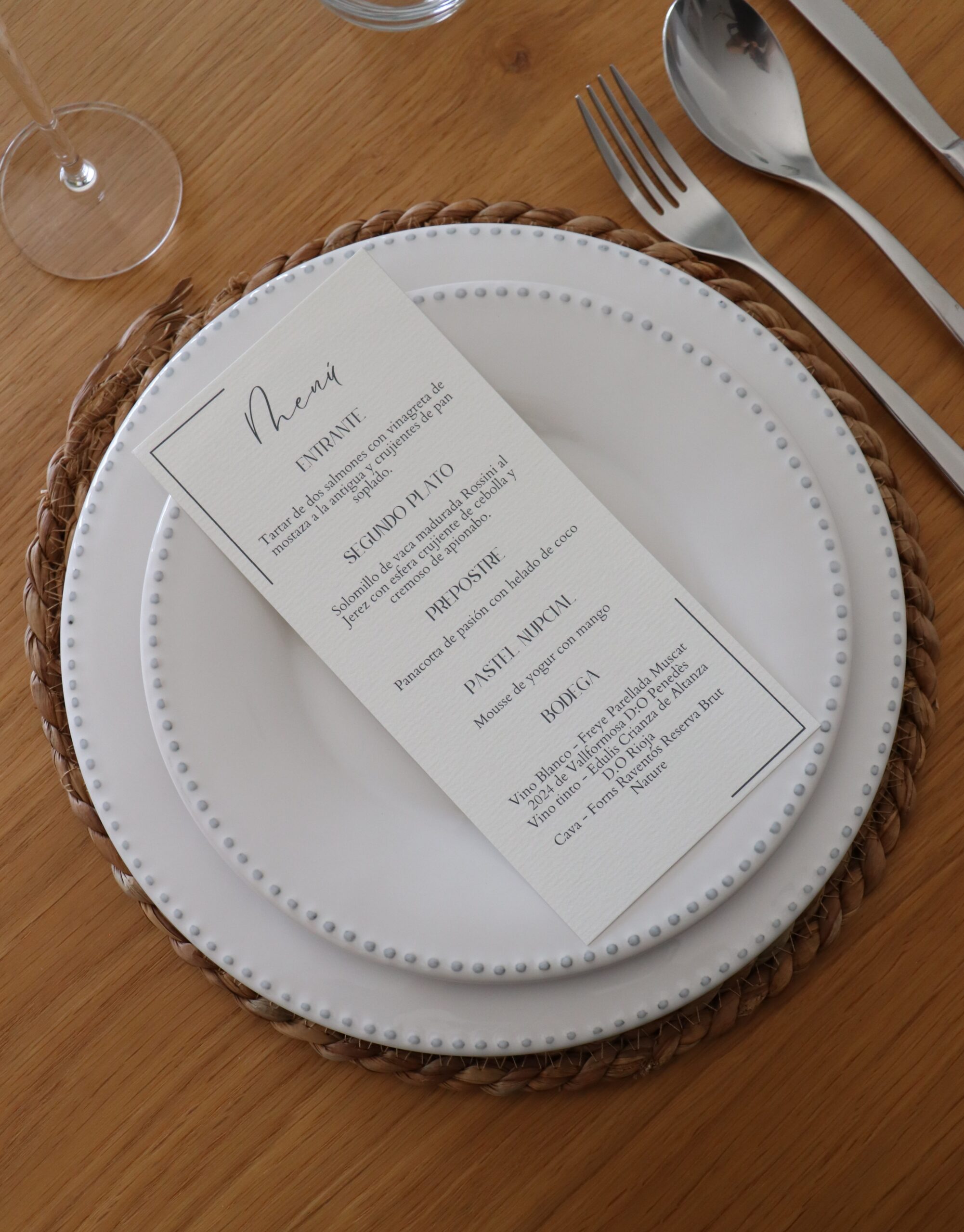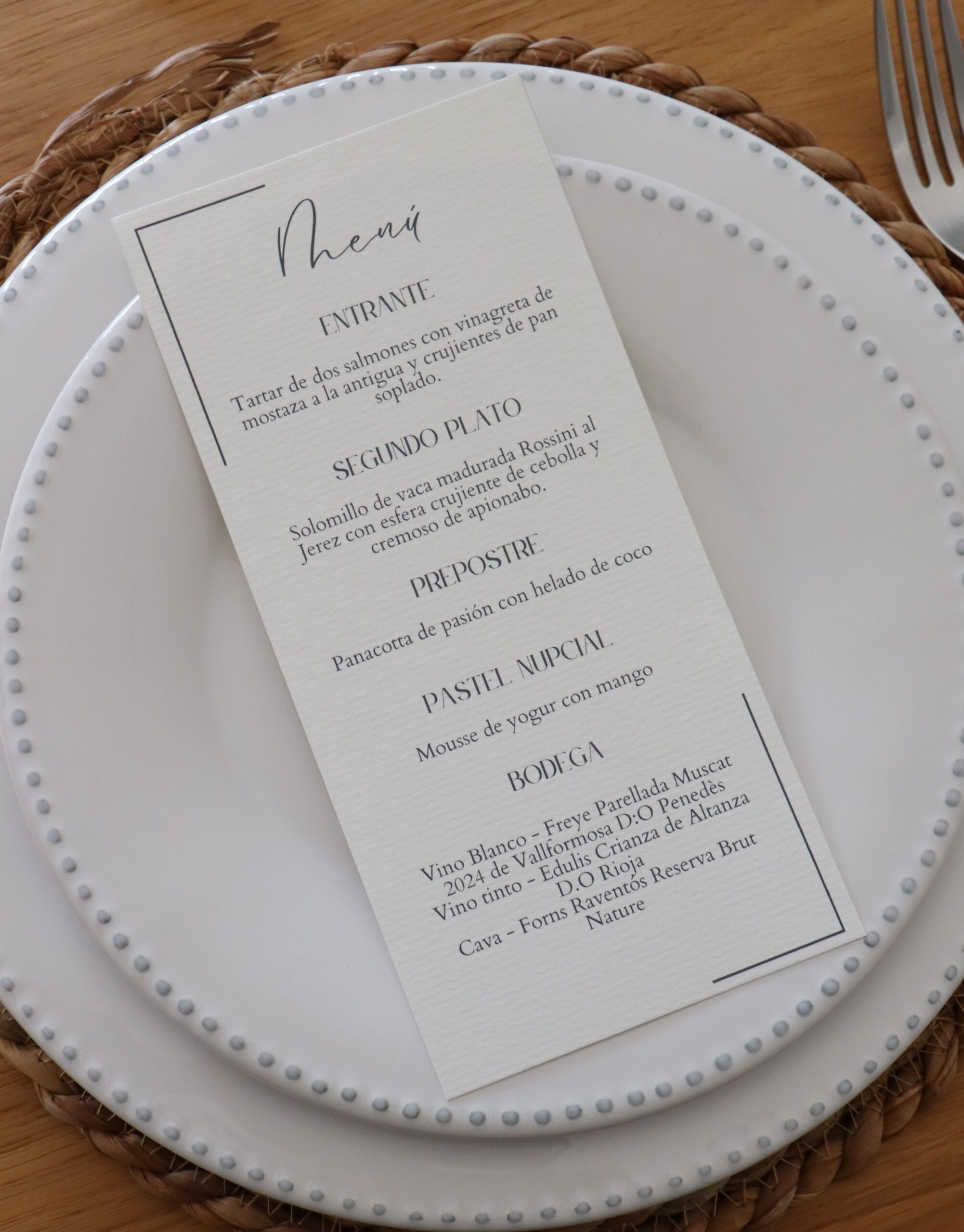 Impresas en papel texturizado de gran calidad, cada minuta se adapta al menú y paleta de colores de tu celebración.