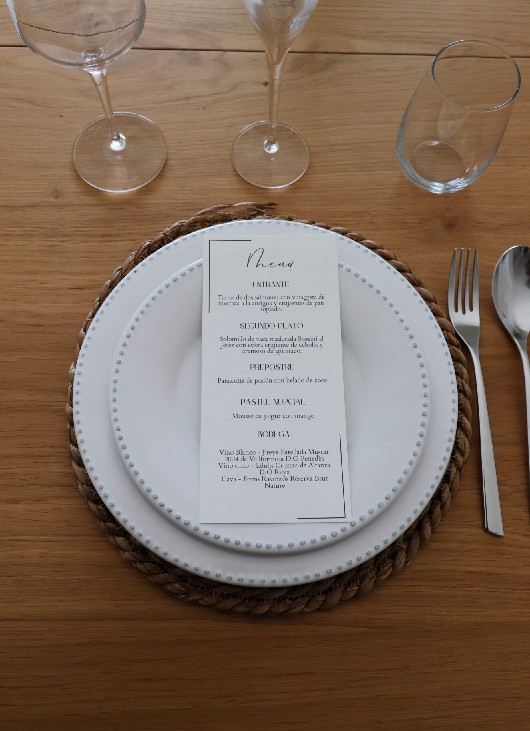 Su marco lineal negro y su caligrafía fluida aportan un toque moderno y sofisticado, ideal para bodas urbanas, clásicas o con decoración contemporánea.