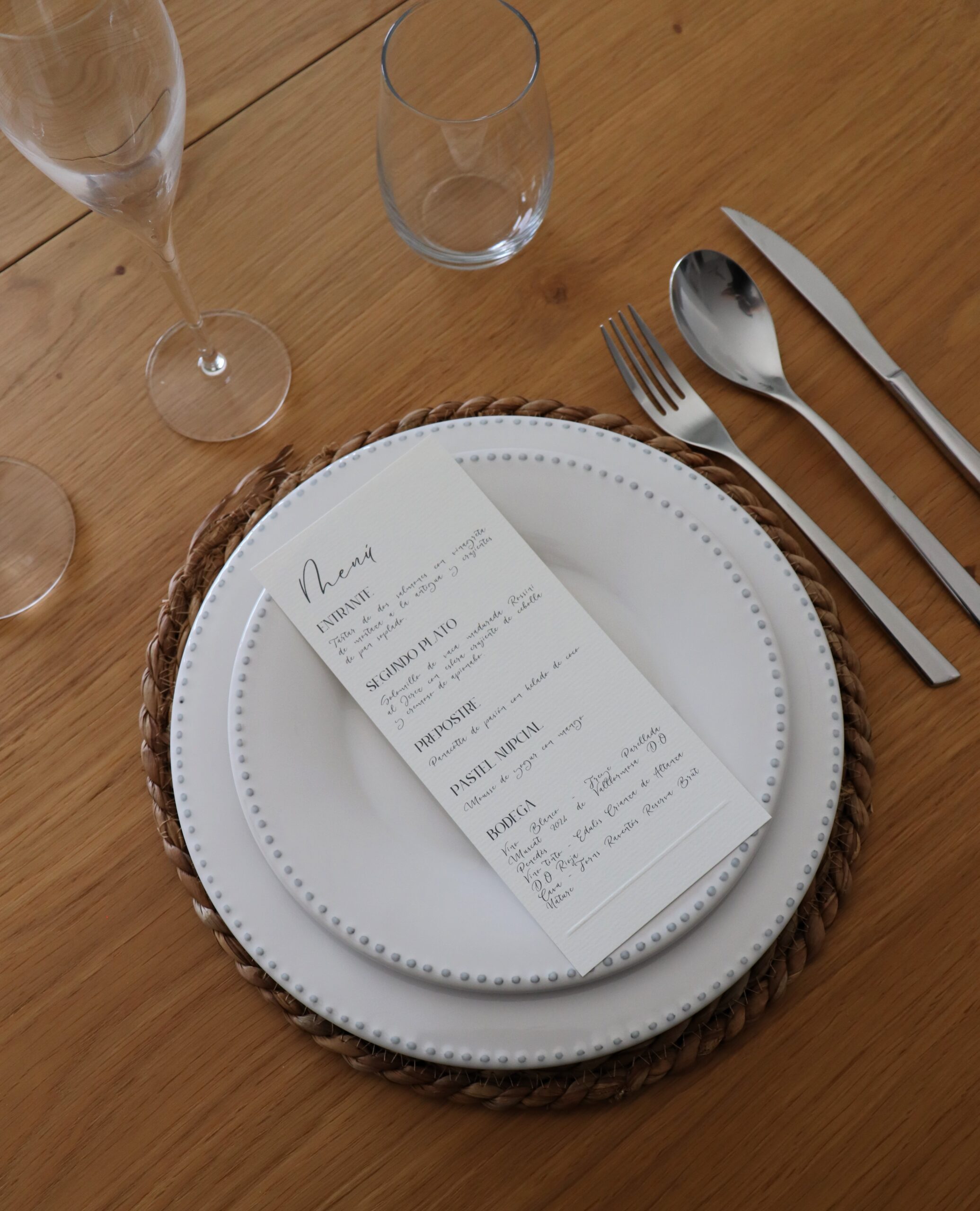 Ideal para bodas íntimas, rústicas o de inspiración vintage, esta minuta transforma el menú en una pieza decorativa única que no pasará desapercibida sobre el plato.
